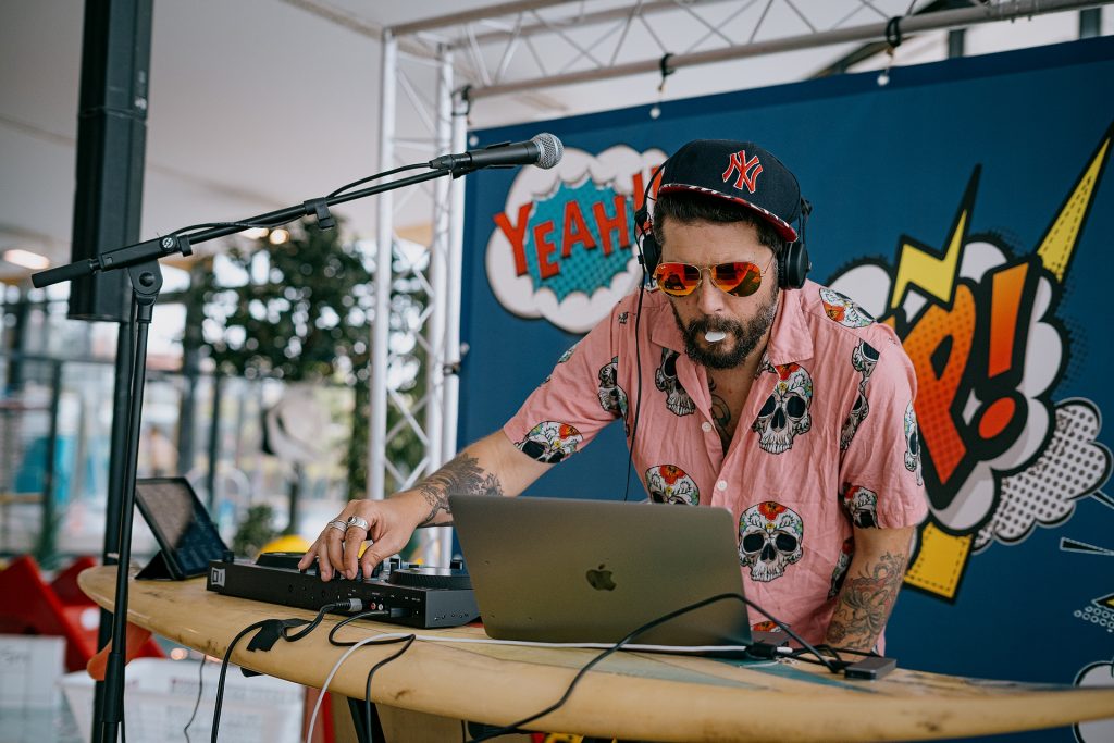 Viens danser et chanter sur les sons choisis par DJ the KID accompagné de sa guitare électrique ! Un desk en planche de Surf , lunettes et blouson dorés , la coolitude absolue !
