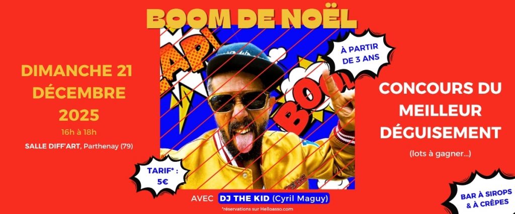 Cette année, on expérimente un nouveau format pour le traditionnel événement familial de noël : une super boom, comme pour les grands, avec des jolies lumières et une giga boule à facettes, le tout orchestré par Dj The Kid (alias Cyril Maguy).
